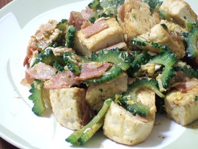 Este é um dos pratos típicos de Okinawa, um refogado à base de carne de porco, tofu e goya ou nigauri. Pela foto pode parecer um tanto grotesco, mas champuru significa "misturado" e apesar da aparência, é muito saboroso! Adoramos e sempre que preparo aqui em casa é inevitável lembrarmos com saudades das férias que já passamos lá. Um lugar lindo e paradisíaco!