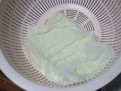 Envolva o tofu em papel toalha e coloque num prato. Leve ao microondas por 10 minutos em potência alta. Coloque o tofu num escorredor e deixe "chorando" alguns minutos. Corte em cubos de 2 a 3 cm e enxugue bem com papel toalha.